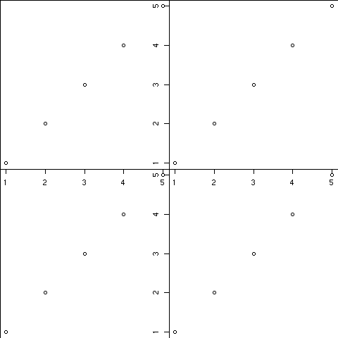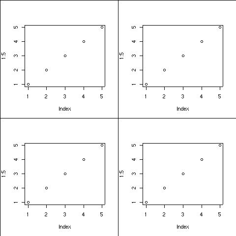 ## 4つのグラフィックス間にすき間を全く置かない極端な例 ## 当然タイトル、軸ラベルは置けない par(mfrow = c(2, 2)) par(mar = c(0, 0, 0, 0)) # グラフィックス領域と作図領域間のすき間をゼロにする plot(1:5) box(which = "figure") plot(1:5) box(which = "figure") plot(1:5) box(which = "figure") plot(1:5) box(which = "figure")