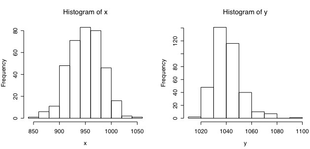 x <- rnorm(365, mean=950, sd=30) y <- sapply( 1:365, function(i) max(rnorm(500, mean=950, sd=30)) ) par(mfrow=c(1,2)) hist(x); hist(y)