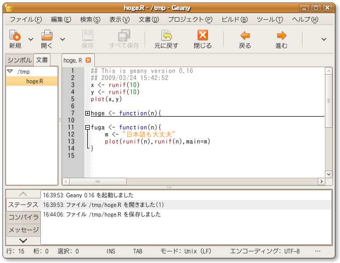 スクリーンショットでは、hoge()が畳まれている。geanyにおけるR/S言語のサポートはまだまだ途上なので、他の言語のような便利さはないが、将来的にはTinn-RやESSなみの機能を有する有望株のような気がしないでもない。
