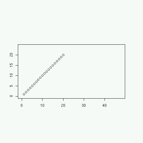 > par(fin=c(6,4)) # グラフィックス画面を 6x4 インチに指定 # 作図領域をグラフィックス画面への割合で指定(この例では上下左右から10%ずつ狭める) # チックマークや軸ラベル、タイトルが入る余地を確保する必要 > par(plt=c(0.1,0.9,0.1,0.9)) > Xlim <- 10*par()$fin[1]*c(0, par($plt[2]-par()$plt[1]) > Ylim <- 10*par()$fin[2]*c(0, par()$plt[4]-par()$plt[3]) > plot(1:20,1:20, xlim=Xlim, ylim=Ylim)
