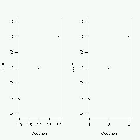 > p1=c(1,2,3); p2=c(5,15,25) > par(mfrow=c(1,2)) > plot(p1, p2, xlab='Occasion', ylab='Score', xlim=c(1,3), ylim=c(0,30)) # 既定動作 # x 軸のチックマークと軸ラベルを描かない > plot(p1, p2, xlab='Occasion', ylab='Score', xlim=c(1,3), ylim=c(0,30), xaxt="n") > axis(1, at=1:3) # 次に位置 1,2,3 にチックマークと軸ラベルを描く