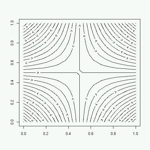 > contour(Im(f(jj)), nlevels=44 , labels=c(">","<")) # 複素数の虚部のイメージ