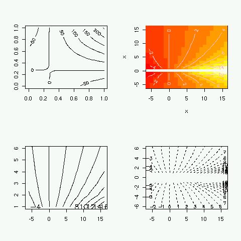 contour(x, x, z, ylim = c(-6, 6), nlev = 20, lty = 2, method = "simple")