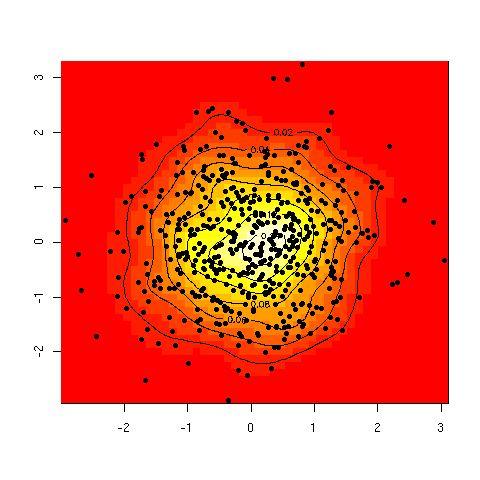 > x <- rnorm(500) > y <- rnorm(500) > require(MASS) > d <- kde2d(x,y,n=50) > image(d) > contour(d,add=T) > points(x,y,pch=20)
