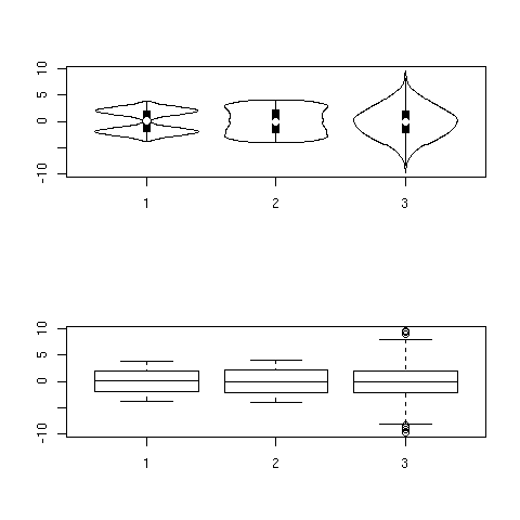 アドオンパッケージ vioplot (パッケージ sm 依存) はバイオリンプロットを描く。これはボックスプロットと核関数による密度推定のプロットを合併したもので、ボックスプロットの両側に推定密度関数を(対称に)描く。二峰分布データの場合、形状がバイオリンのようになることが名前のいわれらしい。下の例(example(vioplot))の上側がバイオリンプロット、下は同じデータのボックスプロット。