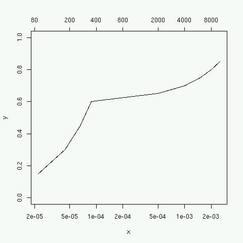 # r-help 記事より (Marc Schwartz, 2004.3.26) > x <- c(1.1 * 1:4, 25 * 1:5) / 50e+03 > y <- c(0.15 * 1:4, 0.6 + 0.05 * 1:5) > old.par <- par(no.readonly=TRUE) > xlim <- range(x) > ylim <- c(0, 1) > plot(x, y, type = "l", log = "x", xlim = xlim, ylim = ylim) > axis(3, labels = axTicks(3) * 4e06) > par(old.par)