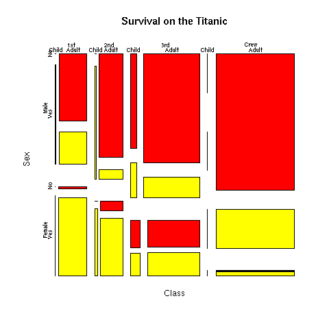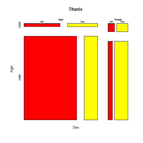 mosaicplot(~ Sex + Age + Survived, data = Titanic, color = TRUE)