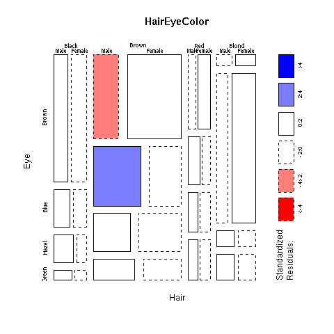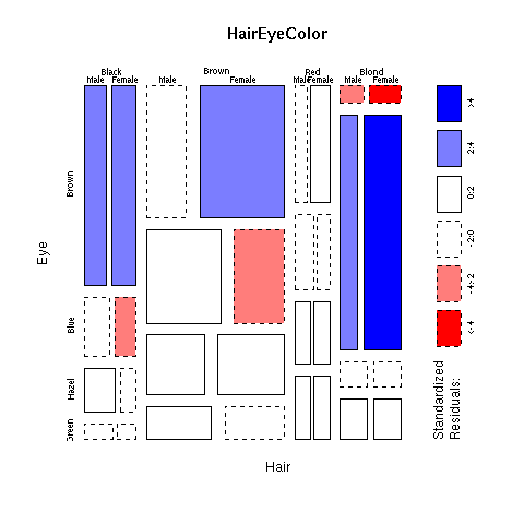瞳の色と髪の色が独立とみなした際に期待されるよりも、ブロンドで青い瞳の女性が有意に多く(濃い青、正規化残差が+4以上)、茶色の瞳でブロンドの女性が少な過ぎる(濃い赤、正規化残差が-4以下)ことを示している。