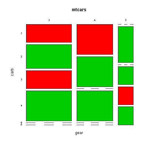 mosaicplot(~ gear + carb, data = mtcars, color = TRUE, las = 1)