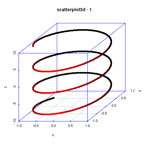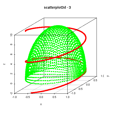 scatterplot3d(x, y, z, color, pch=20, zlim=c(-2, 10),