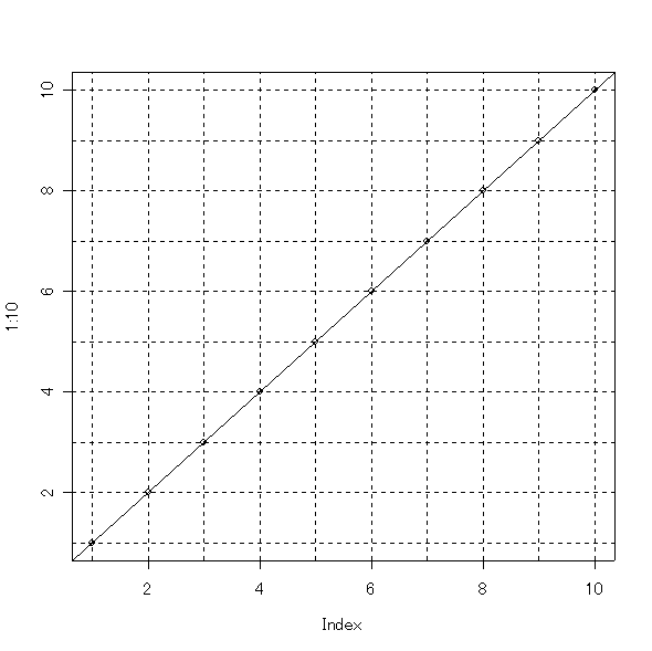 plot(1:10) abline(a=0, b=1) # 切片0 傾き1の直線 abline(h=1:10, v=1:10, lty=2) # 格子を描く