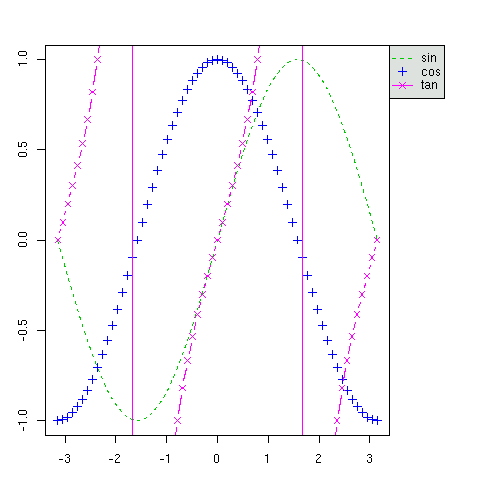 legend(-1, 1.9, c("sin", "cos", "tan"), col = c(3,4,6),