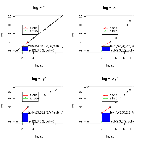 plot(2:10, log=ll, main=paste("log = '",ll,"'", sep=""))