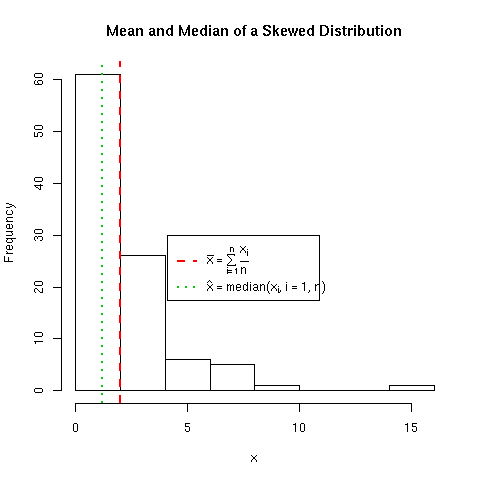 hist(x, main = "Mean and Median of a Skewed Distribution")