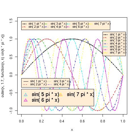 legend(0, -.4, paste("sin(",5:7,"pi * x)"), col=5:7, pch=24, ncol=2, cex=1.5,