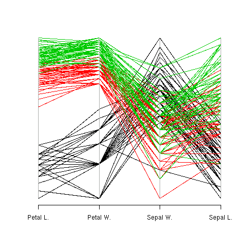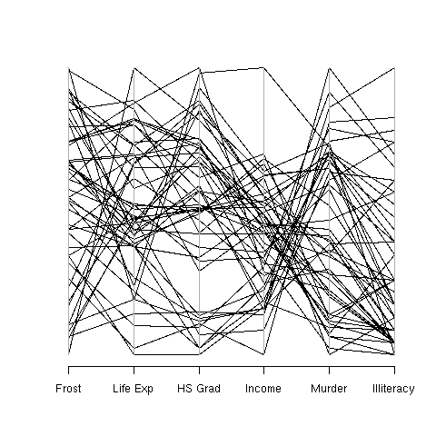 MASS パッケージ中の parcoord() は一つのケースに対する複数の変数値を平行に引かれた 座標上にプロットし、間を線分で結ぶ。複雑なデータフレームを図示する一つの方法。