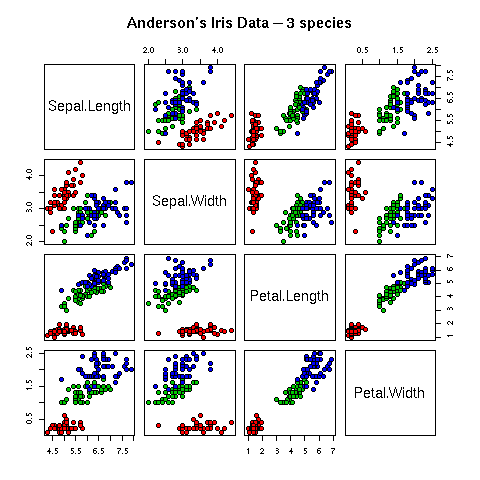 pairs(iris[1:4], main = "Anderson's Iris Data -- 3 species",