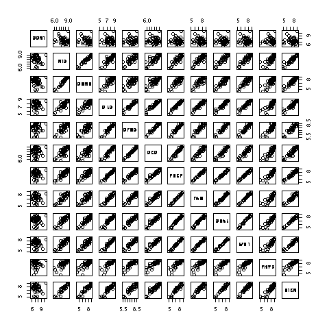 pairs(USJudgeRatings) # 散布図行列を描