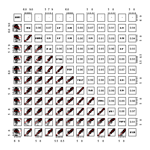 panel=function(x,y, ...) {points(x, y, pch="."); abline(0,1,col=2)},