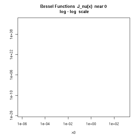 main = "Bessel Functions J_nu(x) near 0\n log - log scale")