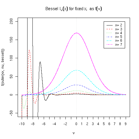 matplot(nu, t(outer(xx, nu, besselI)), type = 'l', ylim = c(-50,200),