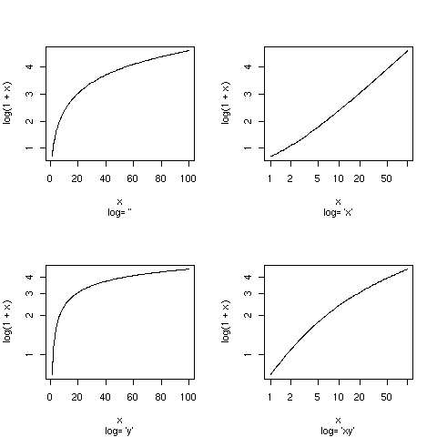 curve(log(1+x), 1,100, log=ll, sub=paste("log= '",ll,"'",sep=""))