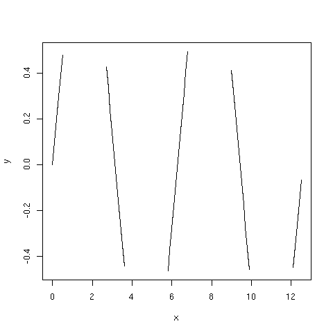 > x <- seq(0,4*pi,by=0.1) > y <- sin(x) > y[abs(y)>=0.5]=NA # abs(y)>=0.5 なら値を NA としておく > plot(x,y,type='l') # abs(y) < 0.5 の部分だけをプロット