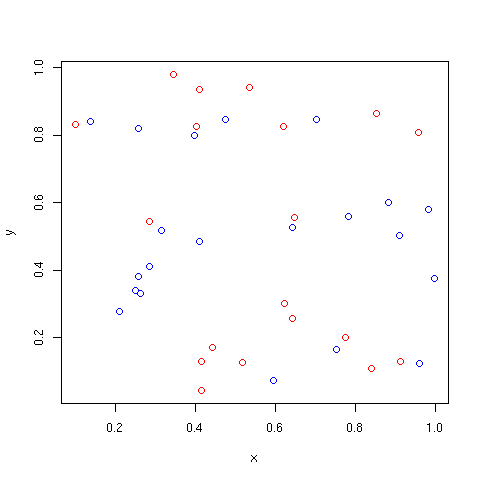 x <- runif(40); y <- runif(40); z <- runif(40) plot(x, y, col = ifelse(z>0.5, "red", "blue")) # z>0.5 なら赤で、その他は青で点プロット