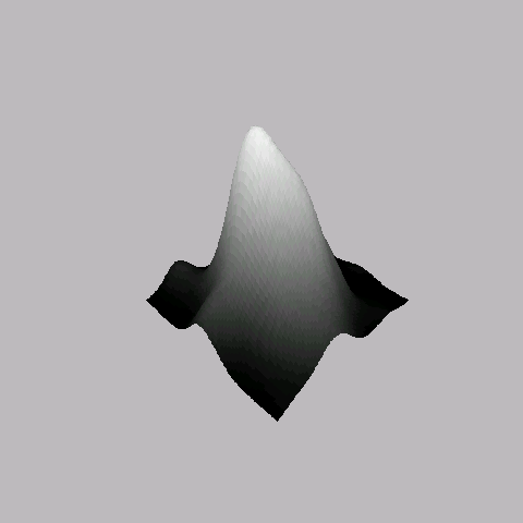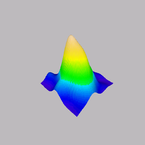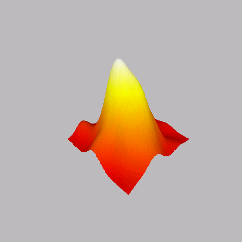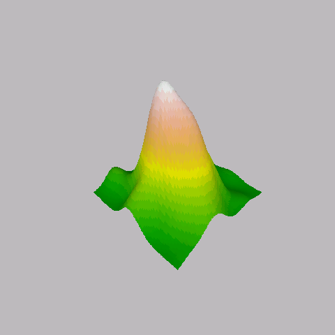 # Now lets look at an example of using it: # first lets build some random surface library(MASS) x <- cbind(rnorm(100), rnorm(100)) x <- kde2d(x[,1], x[,2], n = 100)$z # now lets plot it! par(bg = "gray") persp(x, col = surf.colors(x), phi = 30, theta = 225, box = F, border = NA, shade = .4)