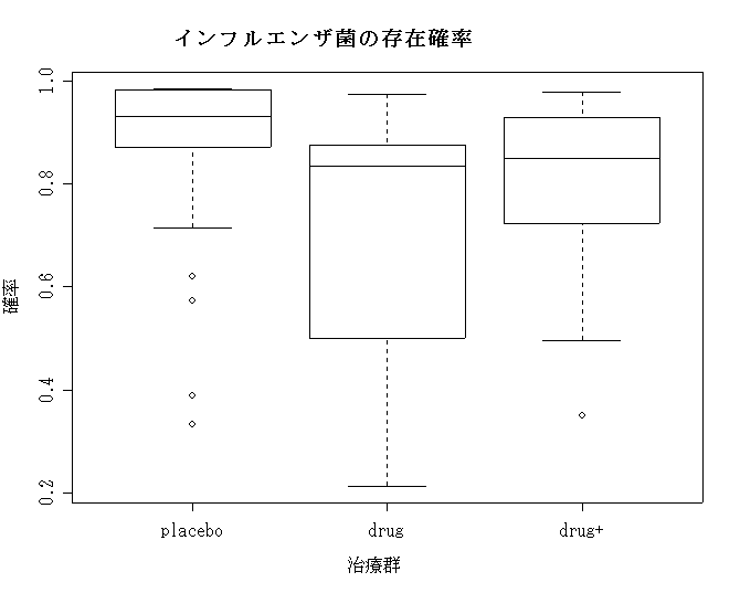 library(MASS) #一般化線型混合モデルのための関数(glmmPQL)はここ attach(bacteria)# データの詳細は ?bacteria でどうぞ #治療と2週間以上かどうかを考慮した条件付確立分布が二項分布を仮定したモデル fit<-glmmPQL(y ~ trt + I(week > 2), random = ~1 | ID, family = binomial) #random の部分でどの変数にレベル2でのランダムネスを許可するか?を指定 #|以下がレベル2のユニット #I()は条件式で帰ってくるファクターをそのままつかえということ library(boot)#inv.logit というlogitの逆関数がbootライブラリにあります。 p<-inv.logit(predict(fit)) plot(trt,p,m="インフルエンザ菌の存在確率",,xla="治療群",yla="確率")