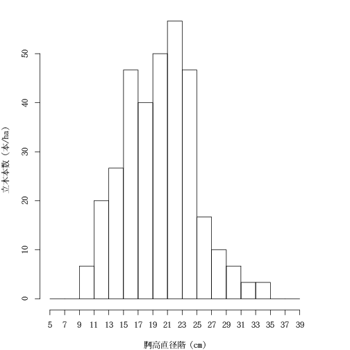 set.seed(77789) x <- rnorm(100, mean=20, sd=5) temp <- hist(x, breaks=seq(5,40,2), axes=FALSE, xlab="胸高直径階 (cm)", ylab="立木本数 (本/ha)", main="") axis(2, 0:5*3, round(0:5*3*10/3,0)) axis(1, temp$breaks)