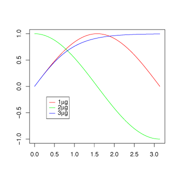 のように数字と数式(ギリシャ文字)を混ぜて書きたいと思いcols <- rainbow(3) plot(sin, xlim = c(0, pi), ylim = c(-1, 1), ann=F, col=cols[1]) a <- NULL b <- NULL a <- expression(paste(1, mu, "g")) b <- c(b, a) a <- expression(paste(2, mu, "g")) b <- c(b, a) a <- expression(paste(3, mu , "g")) b <- c(b, a) legend(0.3, -0.2, b, col = cols, lwd=1)上のようにコードを書いてみたのですが(プロットの部分はダミーです)