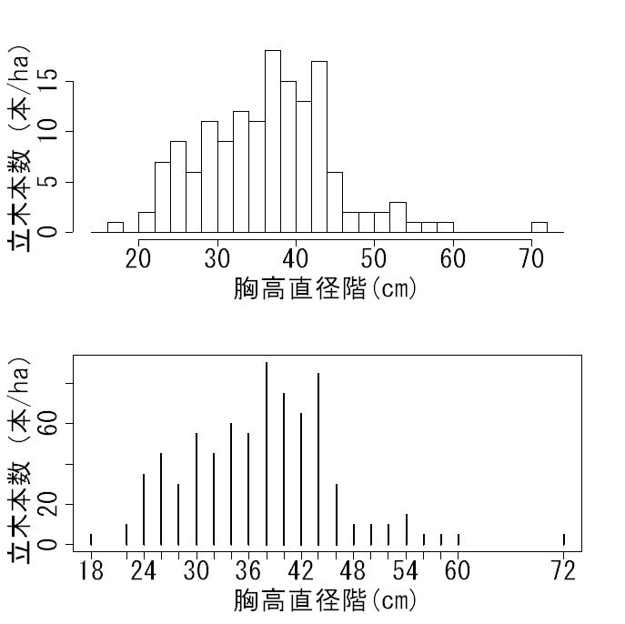 >area=0.3 >layout(matrix(1:2),2) >DBHclass <- round((data$x+0.05)/2,0)*2 >#15cm以上17cm未満は18cmという、2cm刻みの直径階にするための処理 >brks <- seq(14,74,by=2) >hist(DBHclass, breaks=brks,xlab="胸高直径階(cm)", ylab="立木本数(本/plot)") > >DBH_table <- table(DBHclass) >plot(DBH_table/area,type="h",xlab="胸高直径階(cm)", ylab="立木本数(本/ha)") > >dbh<-data.frame(DBH_table/area) >dbh DBHclass Freq 1 18 5 2 22 10 3 24 35 4 26 45 5 28 30 6 30 55 7 32 45 8 34 60 9 36 55 10 38 90 11 40 75 12 42 65 13 44 85 14 46 30 15 48 10 16 50 10 17 52 10 18 54 15 19 56 5 20 58 5 21 60 5 22 72 5このデータフレームから、forループか何かで c(18,18,18,18,18,20,....,60,60,72)というようなベクトルをつくって、それをhist関数に渡す。力業?もっとエレガントな方法があるのでしょうか? -- くに 2007-06-07 (木) 15:53:37