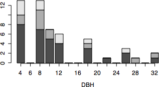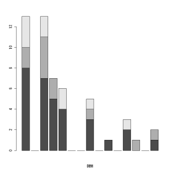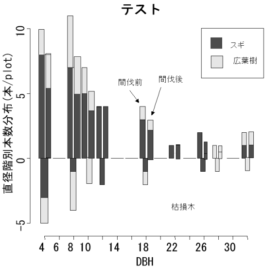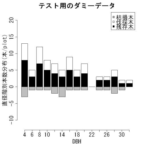barplot(補正サイズ組成[[i]]+補正サイズ組成[[i+1]], names.arg=補正サイズ組成[[1]], main=paste(title, "補正サイズ組成", sep="") )