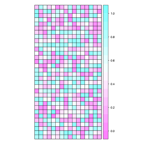 library(sp) grd <- GridTopology(cellcentre.offset=c(932668,1350376),cellsize=c(2000,2000),cells.dim=c(16,32)) grd.sp <- as.SpatialPolygons.GridTopology(grd) grd.d <- data.frame(runif(512), row.names=getSpPPolygonsIDSlots(grd.sp)) grd.spd <- SpatialPolygonsDataFrame(grd.sp,grd.d) spplot(grd.spd)
