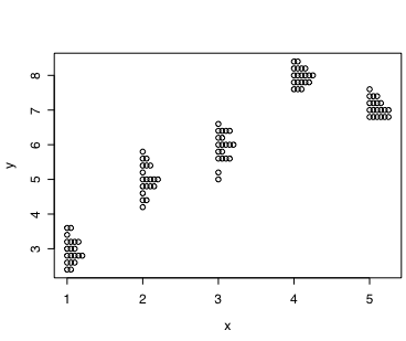 x <- rep(1:5, each=20) # 5群(20ケースずつ)のデータ,平均値・標準偏差は上述の通り