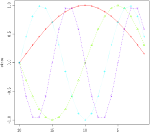 sines <- outer(1:20, 1:4, function(x, y) sin(x / 20 * pi * y)) matplot(sines, xlim=c(20,1), type="o", pch=1:4, col = rainbow(ncol(sines)))