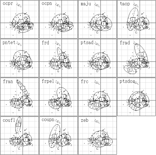 > library(ade4) > data(lascaux) > scatter(dudi.acm(lascaux$ornem, sca = FALSE), csub = 3)