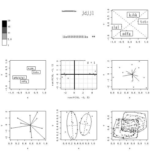 余談ですが,par() で設定して (永続的に) 自分好みの座標を設定することは出来る のでしょうか?"usr" や "xaxp" は値がコロコロ変わってしまうので, 仕方なく xlim , ylim で一時的に変更しているのですが.どうも私の使い方が悪い せいか,"usr" や "xaxp" の適当な使い方が思いつきません.-- 舟尾 2004-05-04 (火) 11:14:34