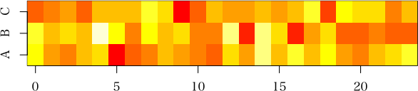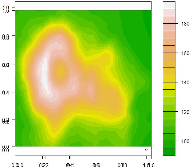 最終的には区間にすべて色の入るlevelplotを作図したいと考えています。N <- c(0, 1, 3, 7, 12, 20, 30, 45, 50, 81) M <- c(10, 20, 40, 60, 65, 75, 90, 95, 98, 100) d <- runif(10, 0, 10) data <- data.frame(cbind(N, M, d)) by1 <- cut(data$N, seq(0, 100, 10), right=TRUE, include.lowest=TRUE) by2 <- cut(data$M, seq(0, 100, 10), right=TRUE, include.lowest=TRUE) results1 <- cbind(tapply(data$d, list(by1, by2), sum)) results2 <- cbind(tapply(data$d, list(by1, by2), mean)) results1 results2 library(lattice) levelplot(results1) levelplot(results2)どうぞよろしくお願いいたします。
