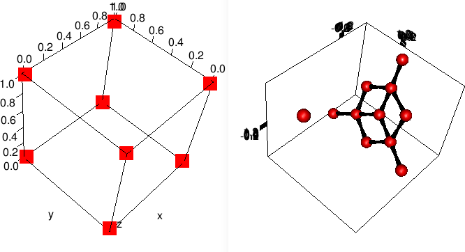 ・Rの出力> A <- matrix(c(0, -4, 4, 1, 4, -3, 1, 2, -1), nrow=3) > A [,1] [,2] [,3] [1,] 0 1 1 [2,] -4 4 2 [3,] 4 -3 -1 > prcomp(A, scale=F, center=F) Standard deviations: [1] 5.579673e+00 9.312648e-01 1.184667e-16 Rotation: PC1 PC2 PC3 [1,] -0.7093545 -0.6210515 -0.3333333 [2,] 0.6431273 -0.3767530 -0.6666667 [3,] 0.2884500 -0.6872788 0.6666667・参考にしたURL