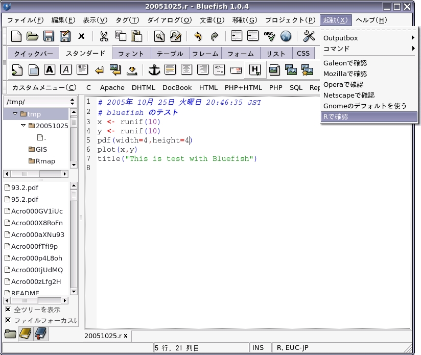 bulefishとは、gtkベースの有名なタグ挿入型HTMLエディタであるが、最新のバージョンでは何故かRもサポートしている。とはいえ、Rのソースが構文強調され、Rをエディタから実行できる程度の機能しかない。いわば余興みたいなものだが、HTMLエディタとしては白眉のbluefish、将来は分からない。