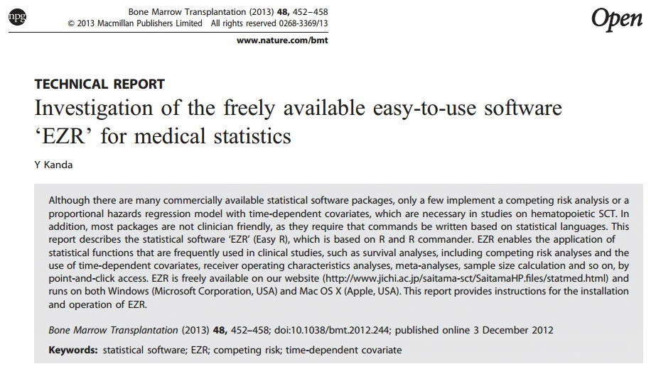 Investigation of the freely available easy-to-use software ‘EZR’ for medical statistics, 神田善伸, Bone Marrow Transplantation v.48 p.452–458, Macmillan Publishers, 2012年12月3日.
