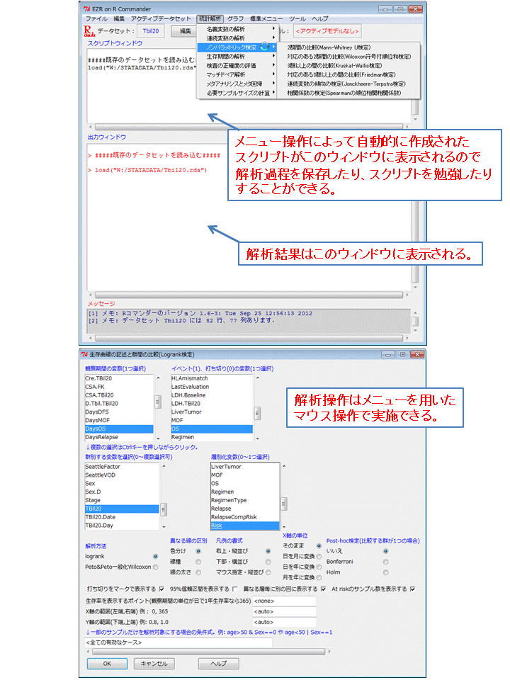 EZR (Easy R)は、マウスによるメニュー操作だけで解析を行うことができるようにしたRコマンダーに、さらに多彩な統計解析機能を組み込んだ統計解析ソフトです。