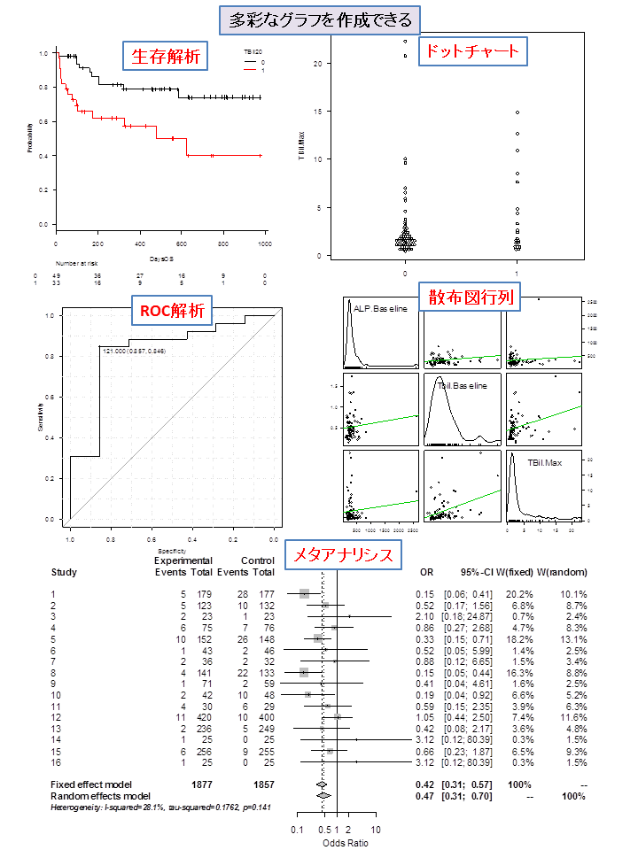 特に生存解析、ROC曲線解析、メタアナリシス、サンプルサイズの計算など、医療統計で役立つ解析が充実しています。また、Ver 1.10からは、解析を行う際にダイアログで選択した変数や条件などが記憶されるようになっています。