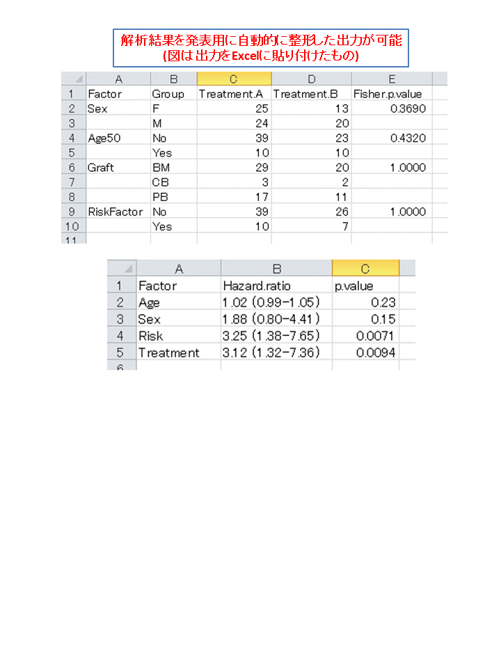 - 解析結果を学会発表スライドや論文原稿に適した形式ですぐに貼り付けることができるような出力が可能である。