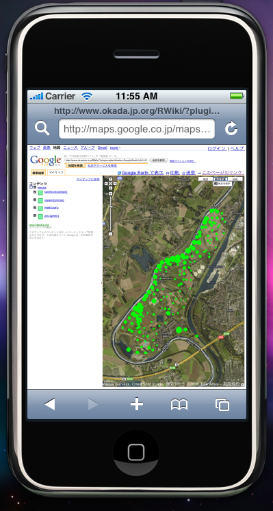 - GE for iPhone2.0 追加>マイマップはNetworkLinkのみKMLで提供する方式のようなので、基本的にはGoogleMapのKMLオーバーレイに準拠しているようです。実は、iPhoneでKMLを表示する手法はトリック(検索からURLを直接叩く)としては存在していたのですが、Googleが正式に対応したことが大きいと思います。 -- okinawa