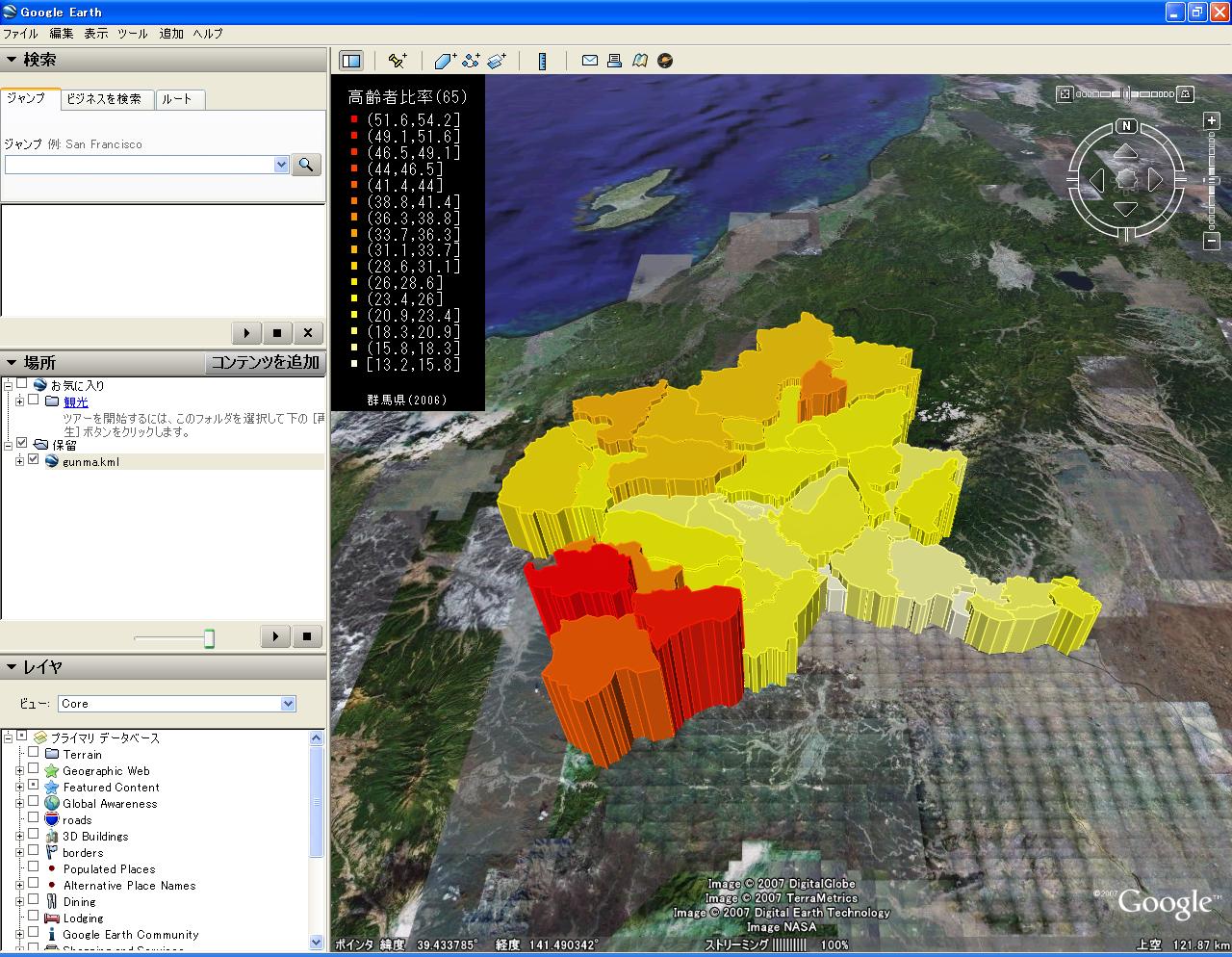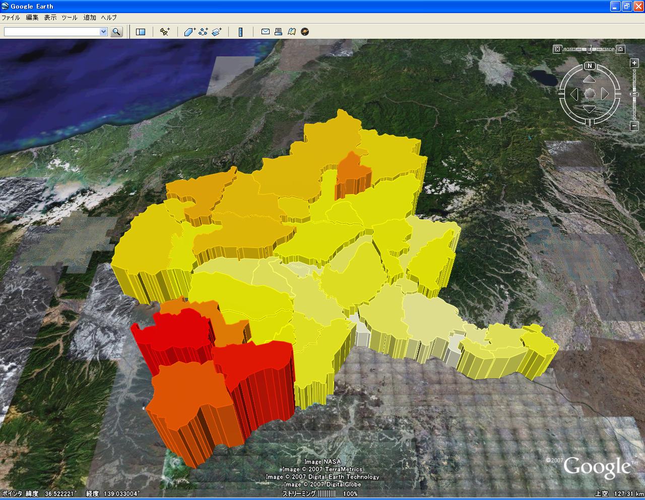 下記の画像は、以前作ったgunma2.kmlをマイマップに登録してiPhone上のGoogleEarthで呼び出したもので、残念ながらポリゴンの高さは無視されるようです。