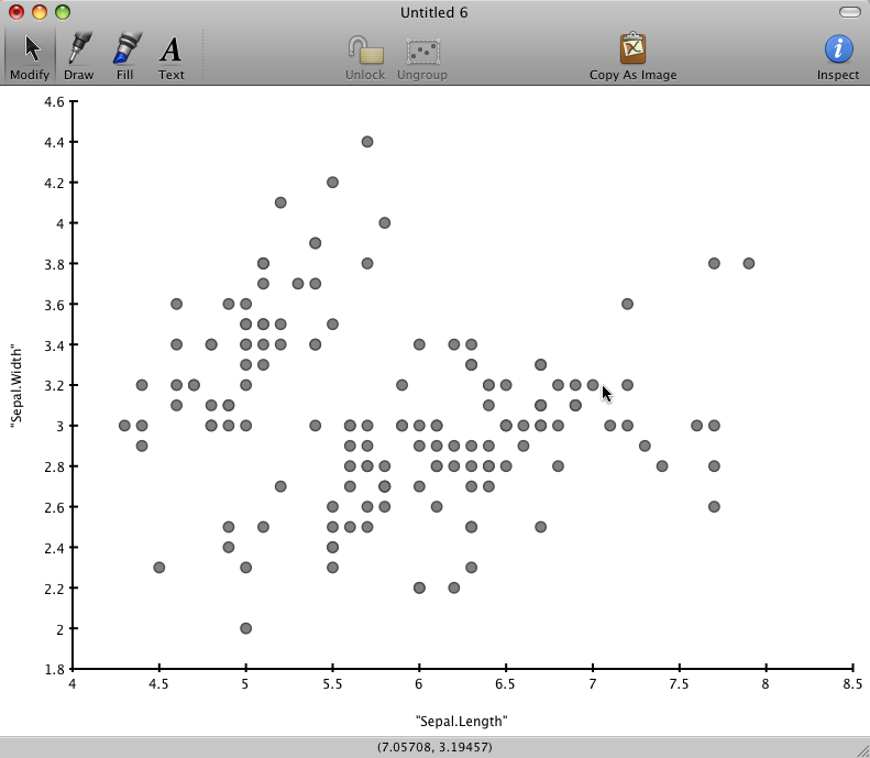 write.table で、データを書き込みます。OmniGraphSketcherは、スペース区切りだとうまく読み込めないようなので、タブ区切りにしてあげます。基本的に単純な散布図を描くのが得意なようなので、Sepal.LengthとSepal.Width で描かせてみましょう。先頭行をカラム名として認識するので、row.names=Fとしておきます。