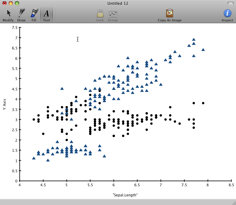OmniGraphSketcher は、データのインポートはクリップボードから直接行うようなので、irisのデータをクリップボードにコピーします。?connections にある通り、MacOS X の場合は、pipe("pbcopy","w") で、/usr/bin/pbcopy コマンドへのパイプをつくってあげれば、クリップボードに出力をまわすことができます。